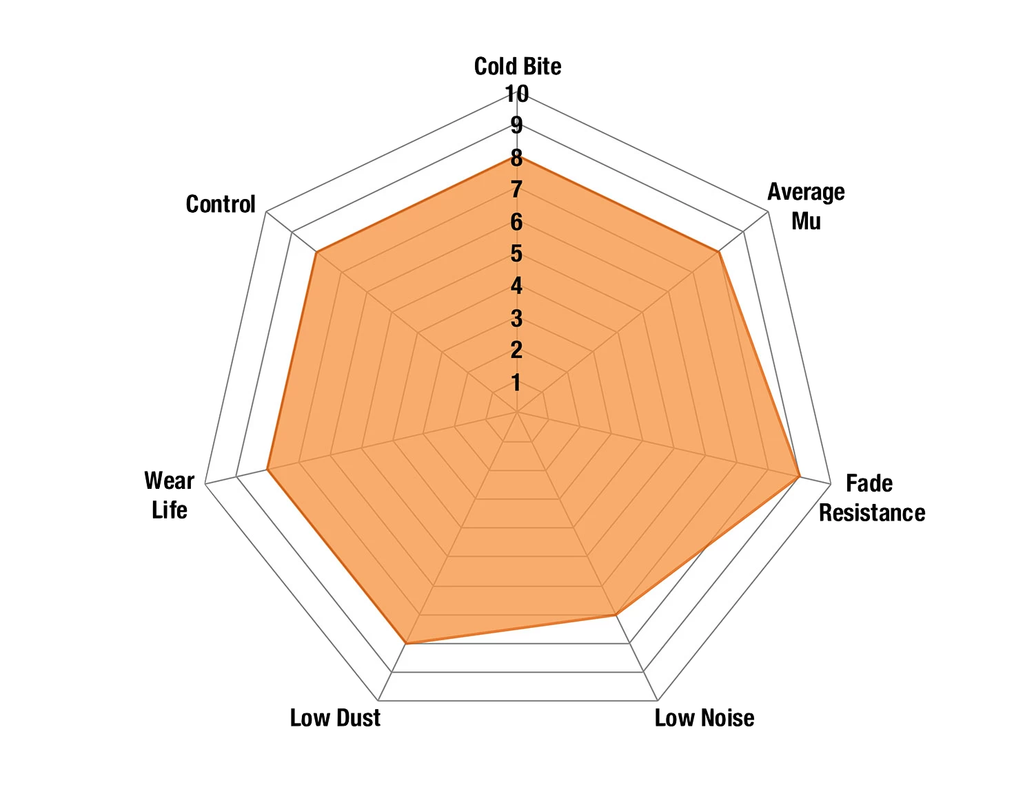 EBC Orangestuff Pad is a brand new race pad and is specially designed for track only use. The deep ‘V’ grooves in the pad are used to catch dirt, debris and dust as well as aiding with venting. The Orangestuff Pad uses a interlayer system which ensures a much stronger bond in the compound for increased strength for racing harsh conditions. This will allow for 3 times the strength against the normal road use organic pad. Orangestuff pads are pre-scorched which means that are already bedded in compared to the ordinary pad but we advise that a minimal bedding procedure is done to marry the pad to the disc. Two laps at intermediate speed is advised, followed by a further two using heavier braking.